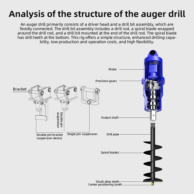 The Excavator Auger works by transmitting hydraulic power through a high-torque drive to the auger shaft. As the auger spins, its sharp teeth break up the soil, and the helical blades carry it upward—allowing you to complete a clean, stable borehole in just minutes.