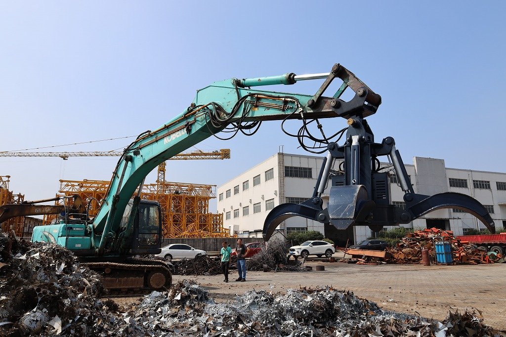At demolition sites, an orange peel grapple helps handle concrete debris, steel bars, and construction waste.